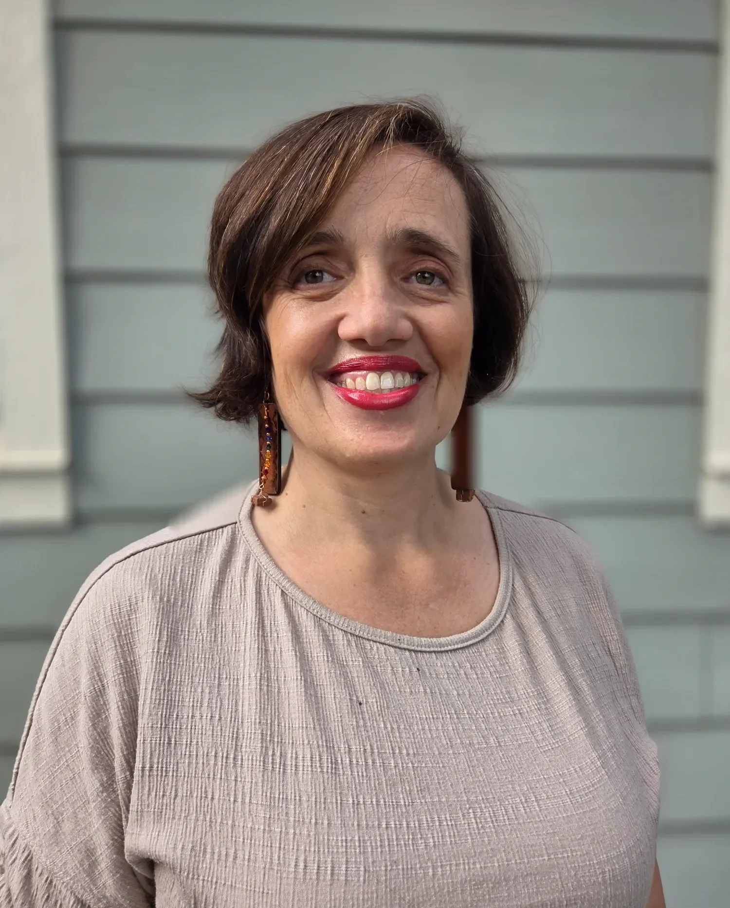 Portrait of a woman with short brown hair, wearing a beige top and colorful earrings, smiling in front of a house."}