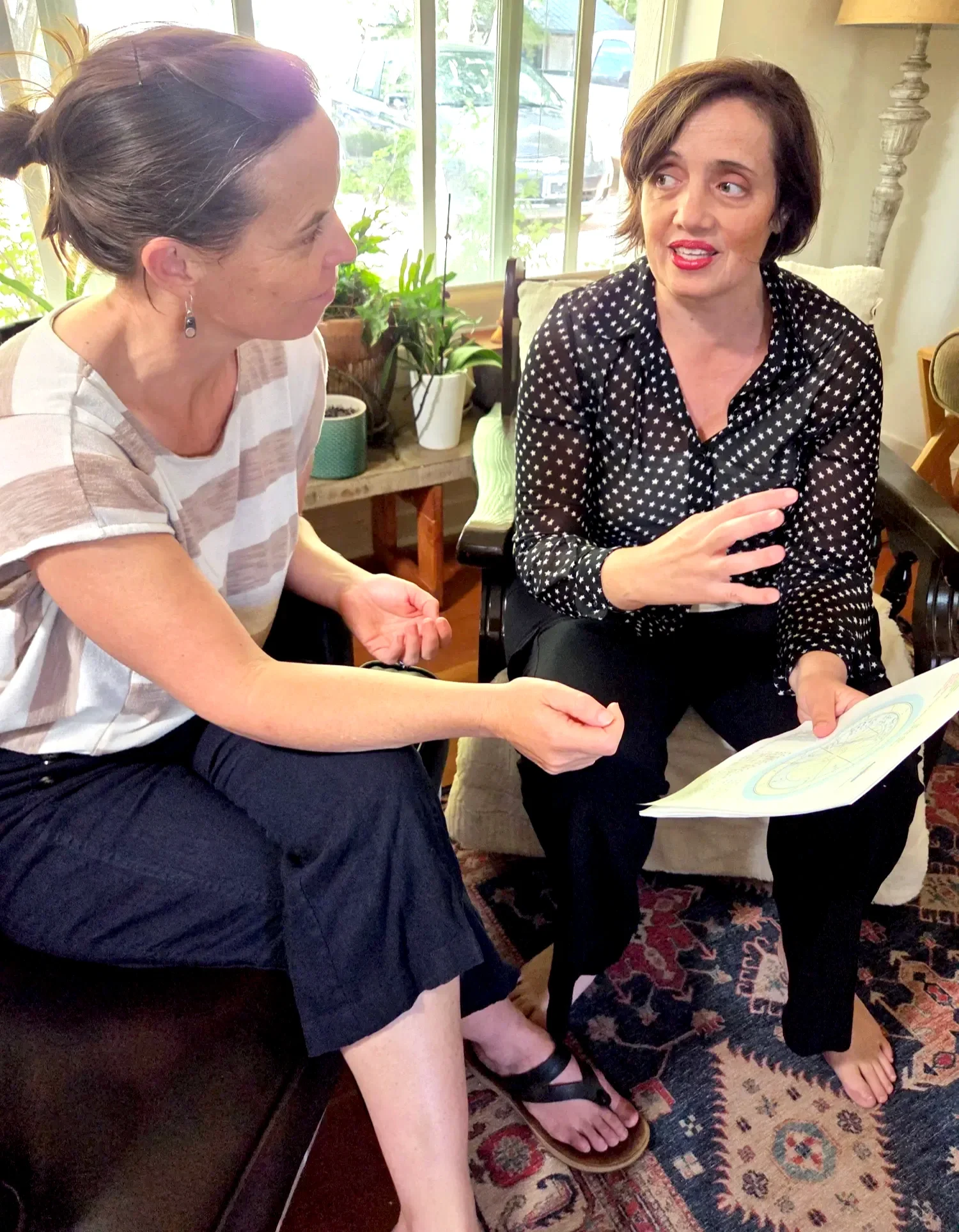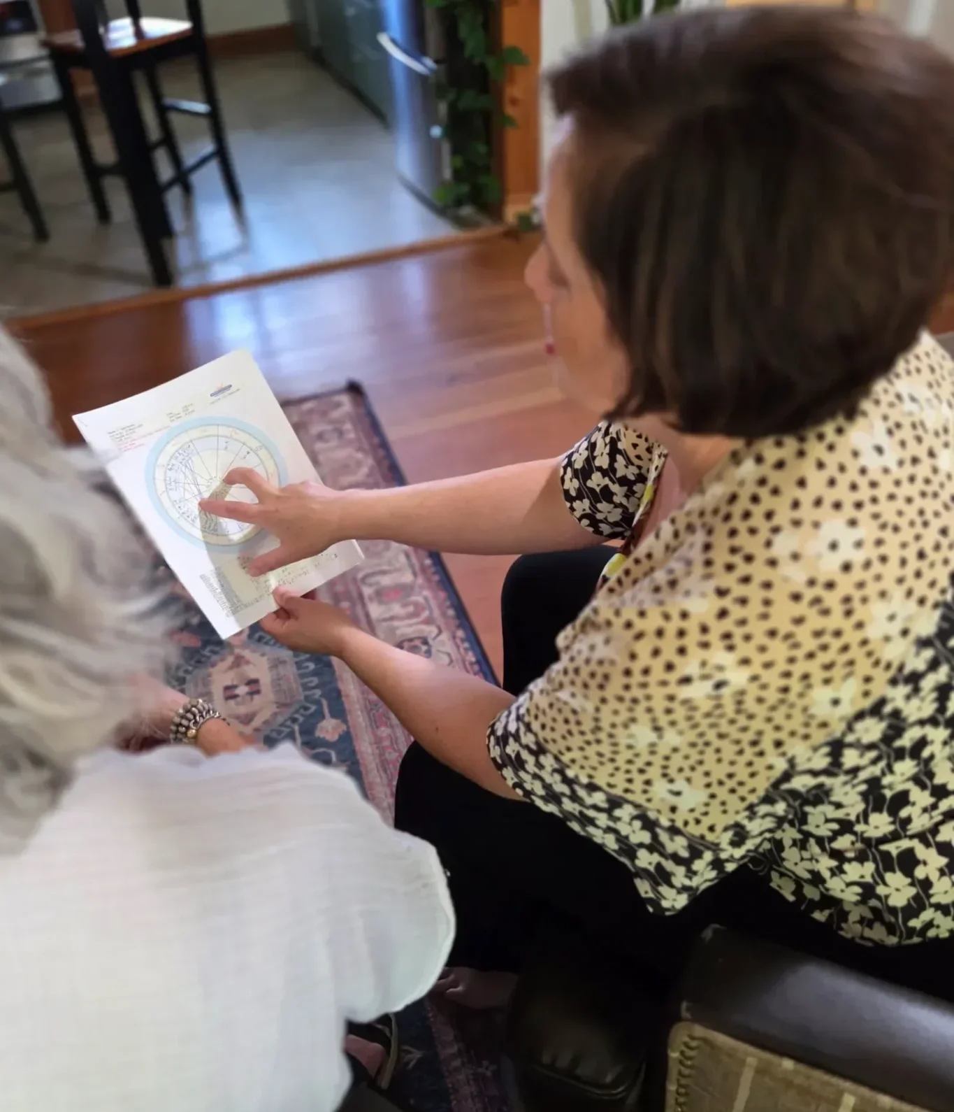 Two women sitting on a couch, one pointing at a colorful astrology chart or diagram on paper.