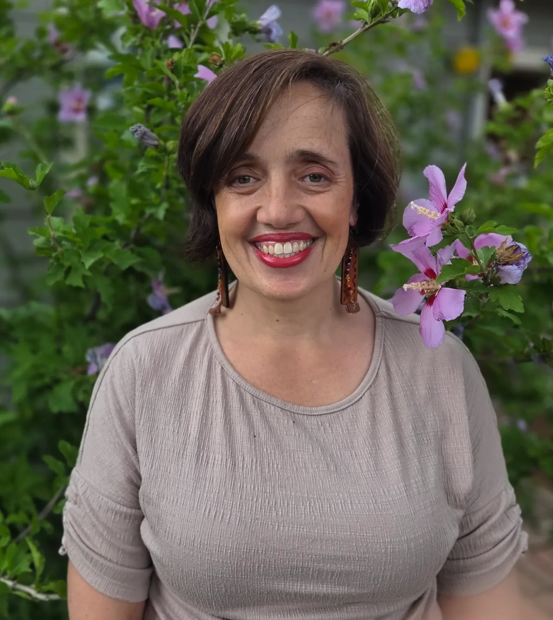 A woman with short brown hair and red lipstick smiling in front of purple hibiscus flowers and green foliage.